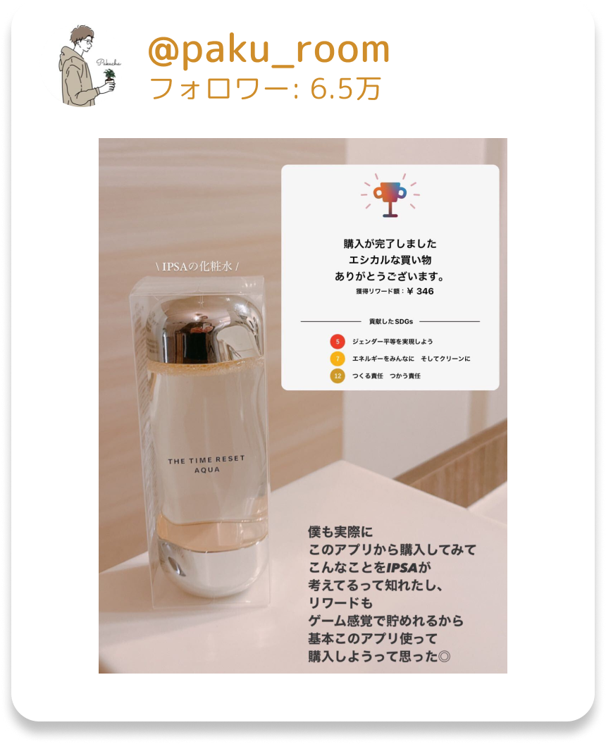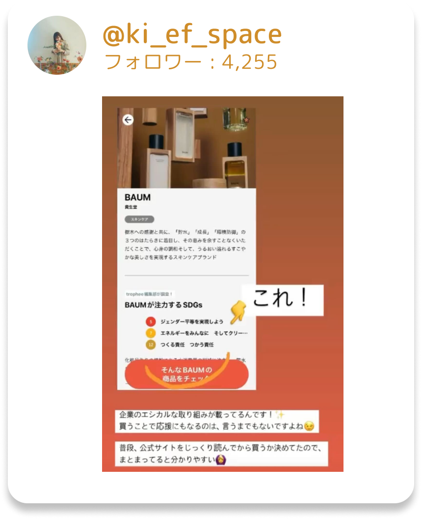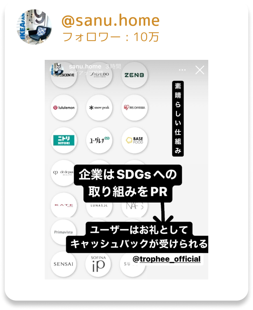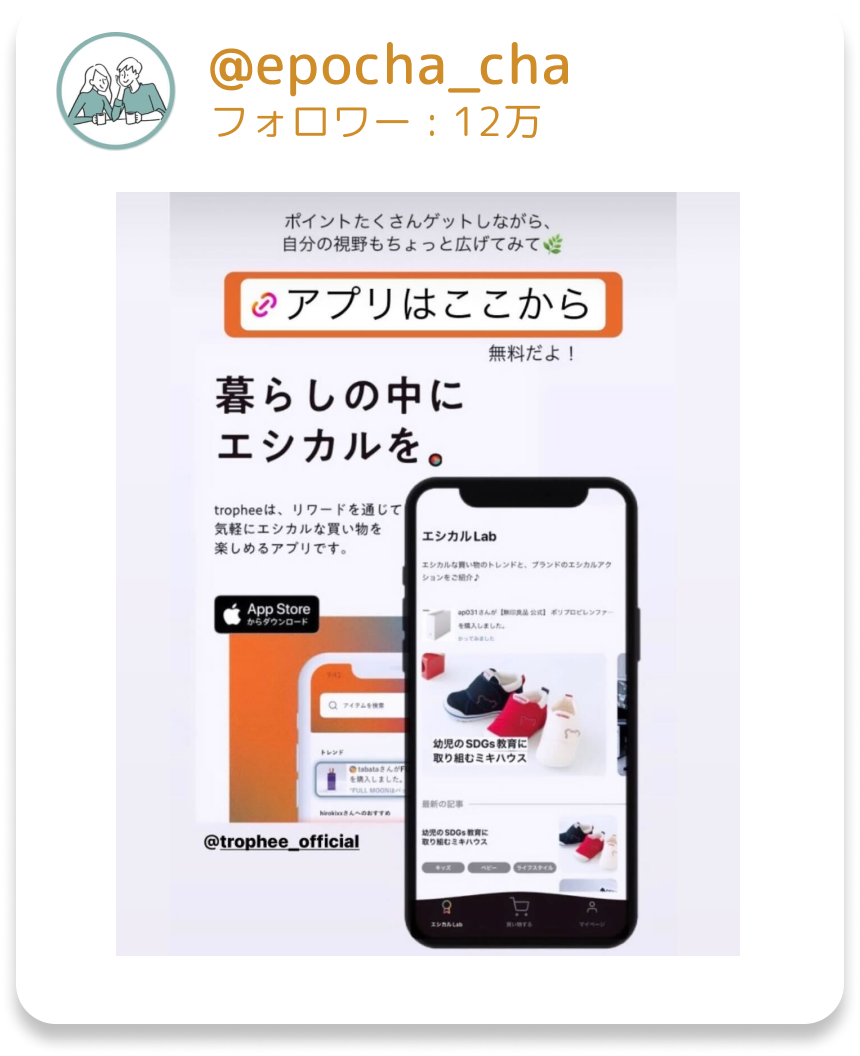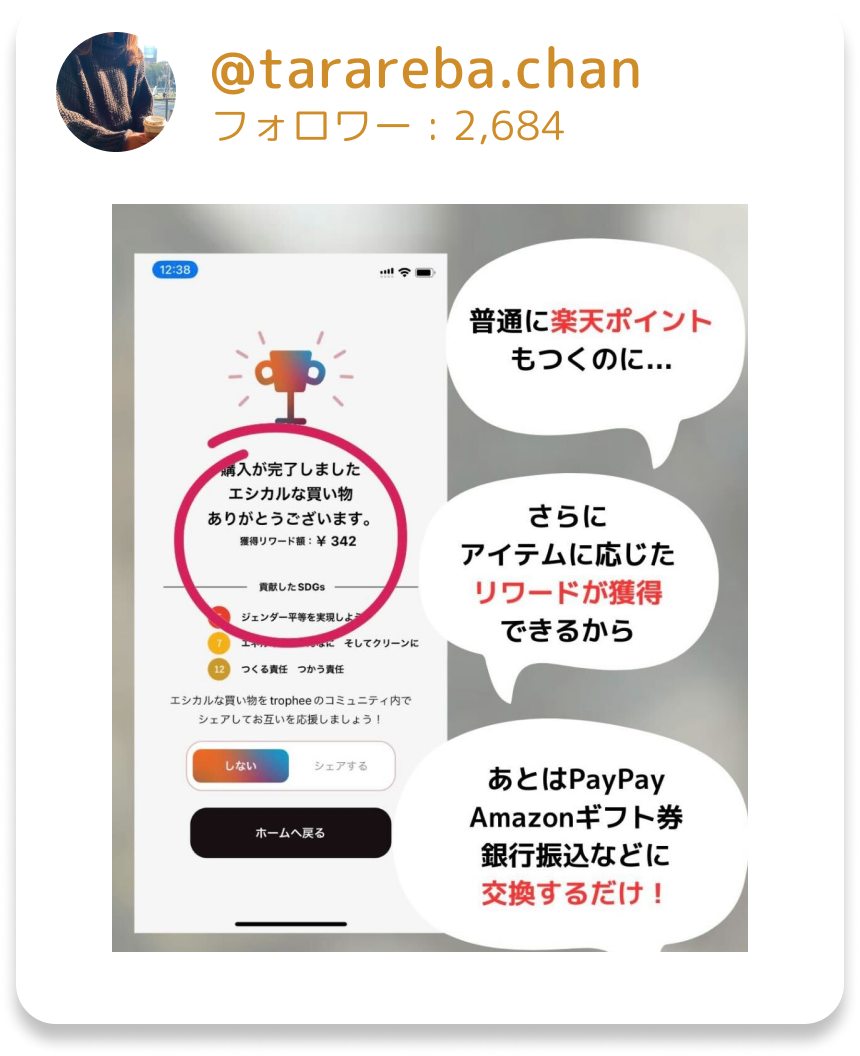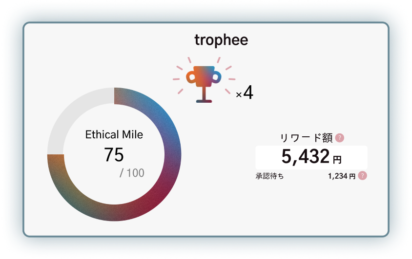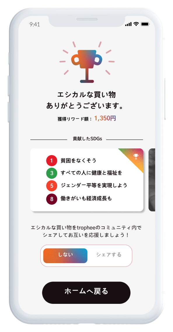 tropheeはユーザー様がエシカルな消費(エシカルな取り組みを 進める企業からのお買い物)をすると、それに応じてリワードが もらえるアプリです。